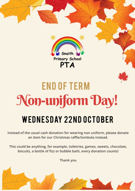 Wednesday 22nd November, we are holding a non-uniform day but instead of a cash donation, please donate an item for the PTA Christmas raffle/tombola. This could be anything, for example, toiletries, new games, sweets, chocolate, biscuits, bubble bath etc ….