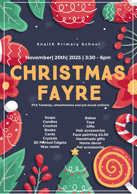 Please note on Monday 10th November, the PTA will be in the Playground Shelter afterschool, to receive/swop Christmas costumes. On Thursday 20th November the PTA will also be holding a costume sale/swap at the Christmas fayre. If you are not able to make either of these, please contact the PTA via Email: snaithpta@hotmail.com.